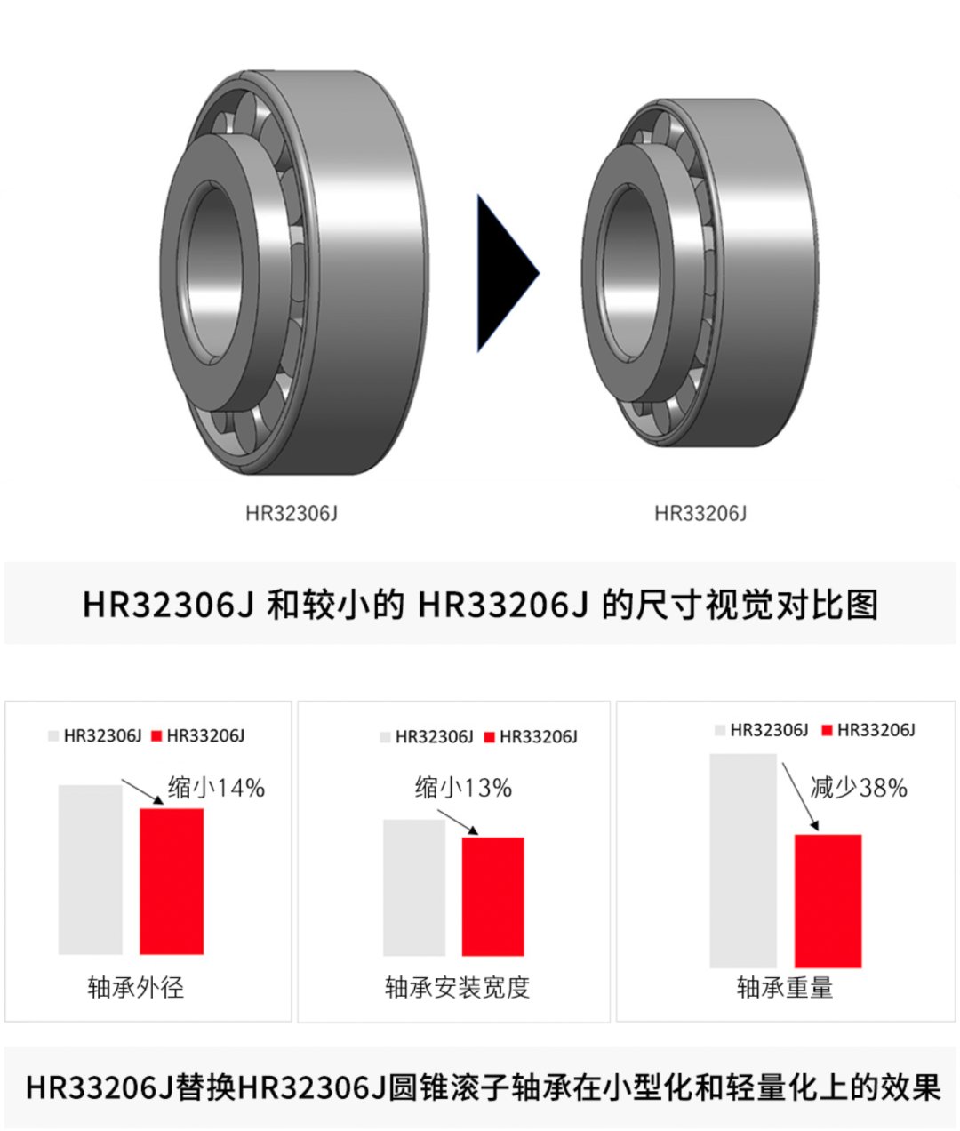 例:圓錐滾子軸承HR32306J可用較小的HR33206J代替。據(jù)估計(jì),更換后軸承力矩和能耗可降低約18%,在產(chǎn)品使用階段每年可節(jié)約電能*4 約48kWh,相當(dāng)于減少CO2排放量*4 約22kg。