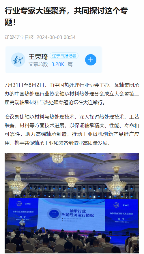 7月31日至8月2日,由中國熱處理行業協會主辦、瓦軸集團承辦的中國熱處理行業協會軸承材料熱處理分會成立大會暨第二屆高端軸承材料與熱處理專題論壇在大連香格里拉酒店舉行。會議聚焦軸承材料與熱處理技術,深入探討熱處理技術、工藝裝備、材料等方面技術進展,助力高端軸承制造,推動工業母機創新產品推廣應用,攜手共促軸承工業和裝備制造業高質量發展。來自國內外軸承材料及熱處理相關單位技術人員、行業專家近300人參加會議。